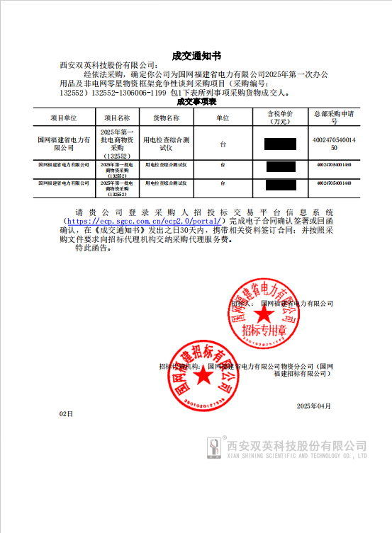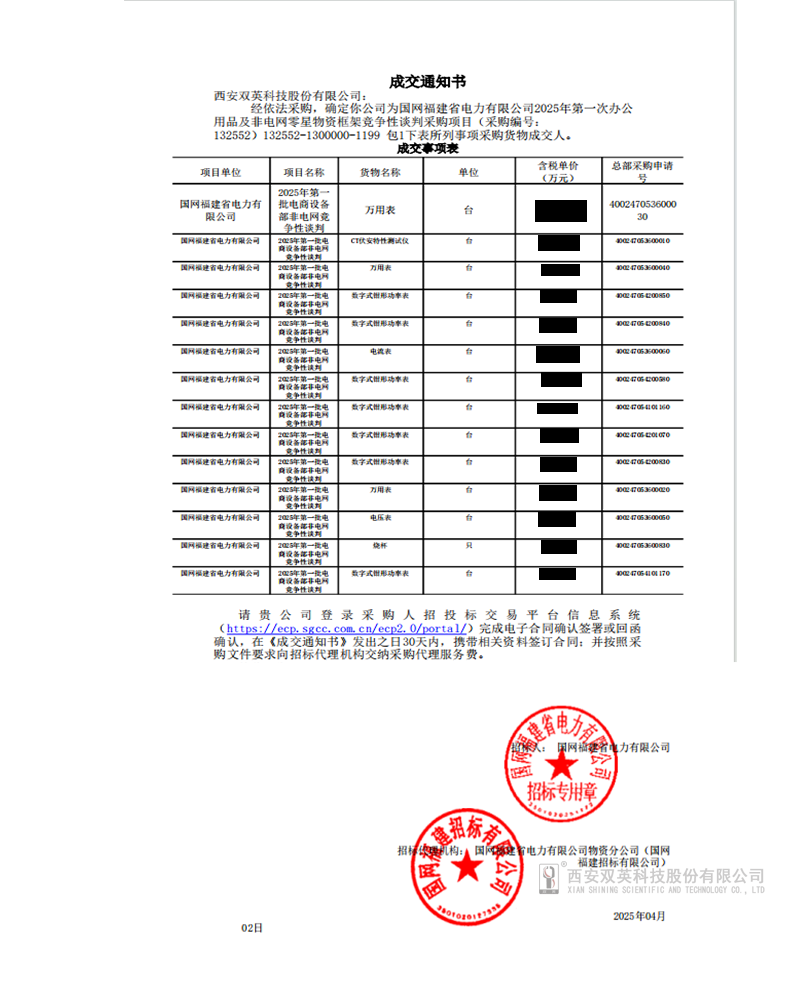 西安雙英憑借幾十年專注行業(yè)的技術(shù)優(yōu)勢和成熟的生產(chǎn)工藝、不斷改進的智能化制造裝備水平、高精度檢測設備等的優(yōu)勢,為用戶提供長期優(yōu)質(zhì)的產(chǎn)品和服務,在國網(wǎng)福建省電力有限公司2025年第一次辦公用品及非電網(wǎng)零星物資框架競爭性談判采購項目中再次中標。