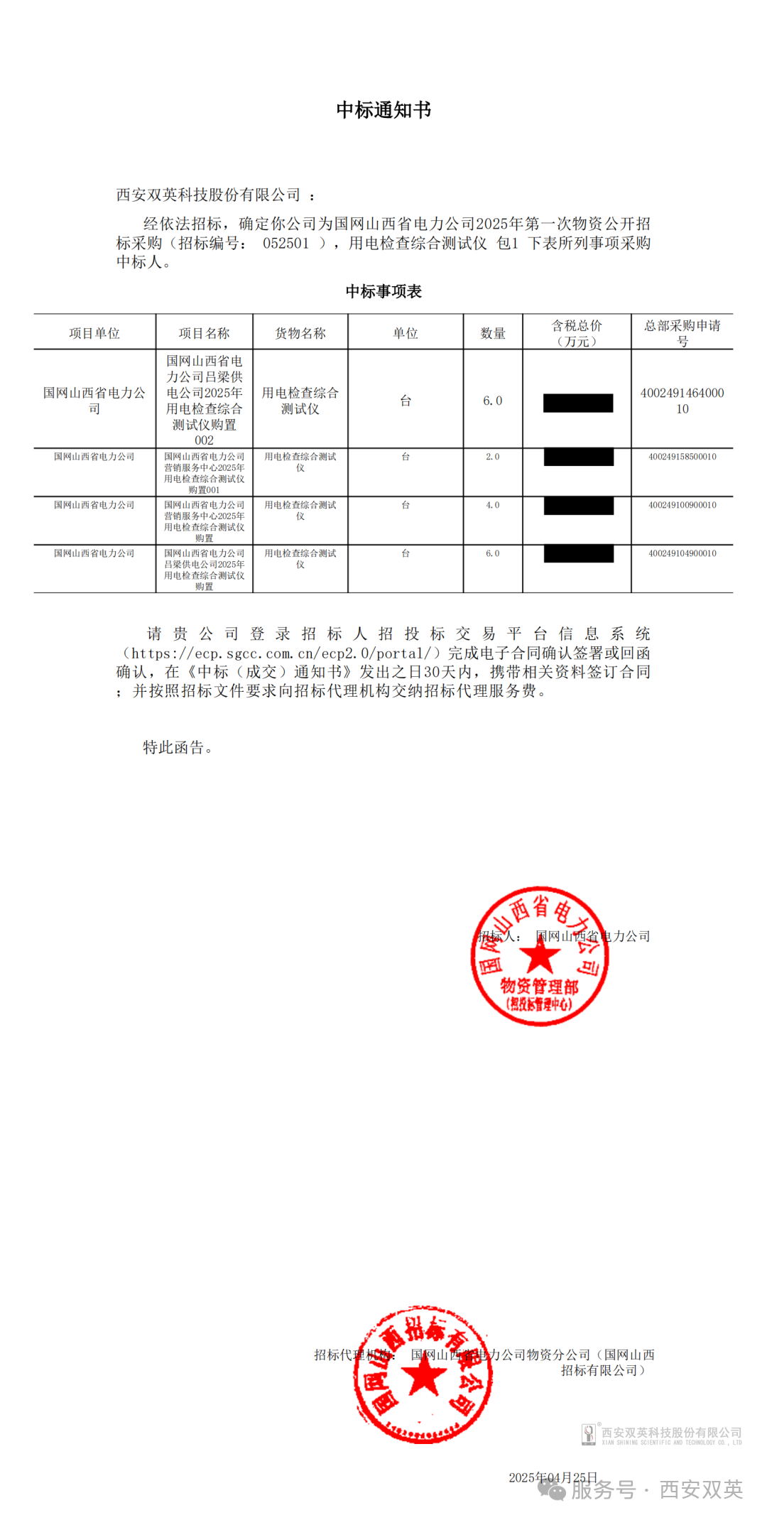 西安雙英是國(guó)內(nèi)專業(yè)的用電檢查儀生產(chǎn)廠家,憑借近三十年在專業(yè)領(lǐng)域的產(chǎn)品優(yōu)勢(shì),以全心全意服務(wù)祖國(guó)電力用戶的理念,在實(shí)踐中將“領(lǐng)先產(chǎn)品+優(yōu)質(zhì)服務(wù)”深度融合,不同于產(chǎn)品銷售模式中僅僅聚焦于產(chǎn)品的功能特點(diǎn),而是通過提供售前咨詢、售中實(shí)施、售后支持等全方位、全周期的服務(wù),使好的產(chǎn)品能在客戶實(shí)際工作中真正使用起來,切實(shí)解決用戶的痛點(diǎn),從而贏得了用戶的信任和滿意,在國(guó)網(wǎng)山西省電力公司2025年第一次物資公開招標(biāo)項(xiàng)目中標(biāo)。
