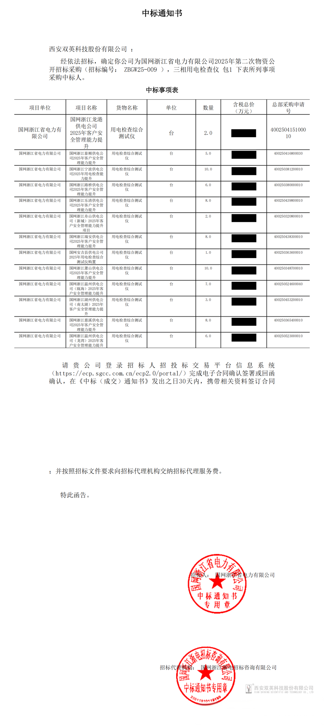 西安雙英科技股份有限公司在國網浙江省電力有限公司2025年第二次物資公開招標采購項目中標用電檢查綜合測試儀和一次通流通壓設備測試儀。