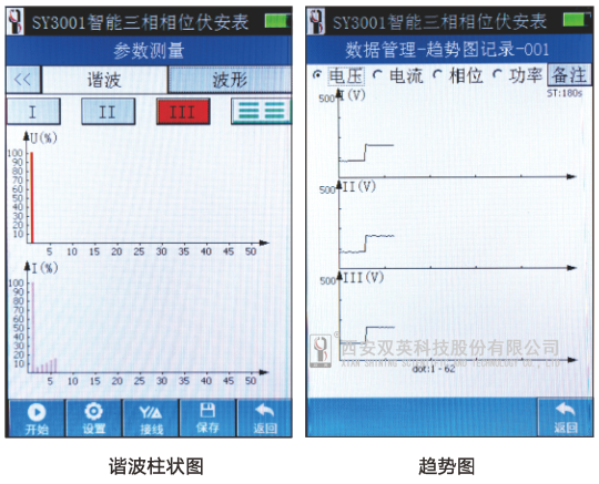 4、可顯示三相電壓、電流基波幅值、2~50次諧波含有率和柱狀圖,具有電能質(zhì)量分析功能;